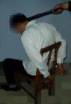 Les gardiens et les prisonniers menottent les pratiquants de Falun Gong à une chaise de métal, les mains derrière le dos, à l’arrière de la chaise (Ici nous utilisons une chaise ordinaire pour la démonstration) Un malfaiteur piétine les menottes et pousse avec force. À la fin, la personne se place debout de tout son poids sur les menottes. À ce moment-là, les menottes deviennent extrêmement serrées aux poignets et les bras et les poignets du pratiquant deviennent engourdis et perdent toute sensation. Les poignets deviennent enflés et bleus, et saignent. En même temps, les policiers et les prisonniers fouettent le pratiquant avec une ceinture en cuir ou battent le pratiquant violemment. Ils versent également de l'eau froide sur le pratiquant.