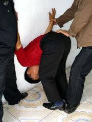 Ma peine au camp de travail se terminait en novembre 2002. Un gardien m’a forcé à remplir l’application « Membre obstiné du Falun Gong. » J’ai essayé de lui clarifier la vérité, mais il m’a amené au bureau de police de la prison. Il m’a tout d’abord frappé au visage et m’a alors menotté les deux mains derrière le dos. Puis il m’a choqué avec une matraque électrique. L’adjoint de la Division No. 4 m’a sauvagement frappé le dos et j’ai perdu le contrôle de ma vessie. Même après m’avoir enlevé les menottes, j’étais incapable de bouger les bras. (Voir démonstration photo 7). Puis ils ont prolongé arbitrairement ma peine de prison.
