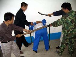 En l’an 2002, le camp de travail a commencé la soi-disant « Lutte de fortification » contre les pratiquants qui refusaient d’abandonner leurs croyances. Un jour au mois d’octobre, Zhao, un policier de la prison, qui avait été transféré du « Bureau 610 » au camp de travail et se vantait que les pratiquants avaient peur de lui, m’a amené le midi au bureau des gardiens de la prison. Six gardiens étaient dans la salle à ce moment-là. Au début, Fan le chef de la division a tenté de me forcer à écrire une « Déclaration de garantie”, et j’ai refusé. Il a commencé à me menotter et à me frapper. J’étais étourdi et je ne pouvais rien entendre de la raclée, mais je continuais à lui clarifier la vérité. Alors le policier Zhao m’a attaché les mains derrière le dos avec une corde. Il m’a levé les bras de force tout en pressant sa jambe dans mon dos. Il m’a poussé la tête entre deux barreaux de la partie supérieure d’un lit jumeaux, ce qui m’a immobilisé tout le corps. Puis il m’a battu le derrière avec le manche d’une hache d’un mètre de long (voir photos de démonstration 5 & 6). Lorsqu’il était fatigué, à bout de souffle et transpirait à profusion, Fan a pris le manche de la hache et a continué à me battre. Eventuellement, je me suis fatigué aussi. Alors Chao a commencé à me lacérer le dos, le cou et d’autres régions avec un fil de fer. Mes vêtements étaient déchirés et trempés de sang. Le garde Ma m’a choqué les genoux, l’intérieur des jambes et le bas de l’estomac avec une matraque électrique. Je ne pouvais plus contrôler mes intestins et ma vessie sous les chocs électriques. Le chef adjoint m’a frappé plusieurs fois au visage. Mes oreilles bourdonnaient et mes dents étaient branlantes. Le chef adjoint a hurlé : « Si tu n’écris pas la déclaration de [garantie], nous te battrons à mort et t’incinérerons immédiatement, et dirons alors que tu t’es suicidé ».