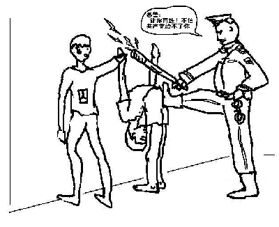 (Commentaires du croquis: le policier dit, "Voilà qui t’apprendra à pratiquer ! Le Parti va t’en faire baver !")