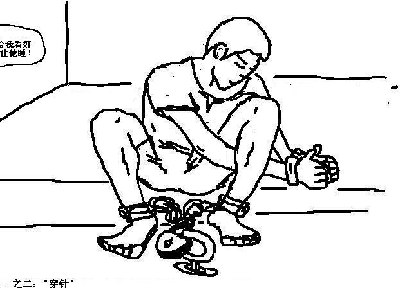 Voici une autre technique de torture infligée aux pratiquants de Falun Dafa. On passe des chaînes au pratiquant, des chaînes que l’on attache au sol (ce qui rend tout mouvement impossible). Puis on attache ses mains entre ses jambes à l’aide des "menottes de la mort" (des menottes spéciales qui sont très serrées).