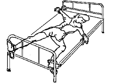 Cette forme de torture est souvent pratiquée par les policiers dans les hôpitaux, les centres de détention et les camps de travaux forcés. On attache chacun des membres inférieurs du pratiquant de chaque côté du lit, ses mains sont aussi attachées de chaque côté du lit, une au-dessus et l’autre en dessous, de manière intentionnelle, à l’opposé l’une de l’autre au maximum, ainsi il lui est totalement impossible de bouger. Parfois on les torture de cette manière pendant une semaine voire plusieurs semaines, pour certains cela peut aller jusqu’à quatre mois.