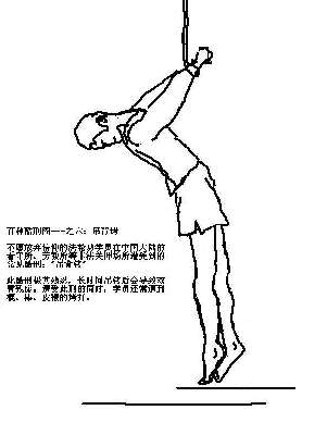 C’est également l’une des formes de torture les plus utilisées dans les camps de travaux forcés et durant les séances de lavages de cerveau pour forcer les pratiquants de Falun Dafa à renoncer à leurs convictions. Cette torture fait remonter le sang à la tête et peut provoquer une perte de conscience, ou même la mort en cas de période prolongée. Parfois les policiers empêchent le pratiquant d’aller aux toilettes, et pendent le ou la pratiquante par les pieds pour l’humilier.