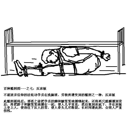 Voici une autre torture très cruelle souvent utilisée dans les camps de travaux forcés et durant les séances de lavage de cerveau. Tout d’abord, on attache les jambes et les pieds du pratiquant, les mains sont attachées derrière le dos. Puis on attache le cou et les jambes du pratiquant ensembles et de manière très serrée, ce qui l’empêche presque de respirer. Puis on le pousse sous un lit (voir croquis), et plusieurs personnes s’assoient sur le lit, ils poussent lourdement sur le dos du pratiquant, ce qui peut provoquer une fracture de la colonne vertébrale. Cette forme de torture provoque souvent de graves blessures.