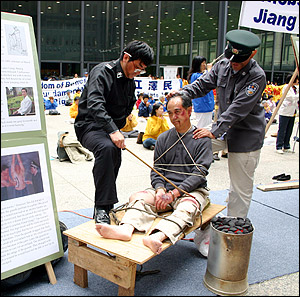 Afin de faire prendre conscience à l’opinion publique de la cruauté de la persécution qui frappe les pratiquants du Falun Gong en Chine, une persécution qui a enclenché des poursuites judiciaires contre l’ex Président Jiang Zemin à la Cour Fédéral de Chicago, les pratiquants de Falun Gong ont mis en scène les méthodes de tortures lors d'une exposition intitulée « Une persécution contre des Principes ».