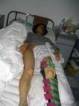 Les blessures des chocs électriques, sur les 2 côtés de ses jambes sont plus graves que sur la photo parce que nous n’avons pas pu prendre la photo d’un angle approprié. Nous pouvons voir des contusions (bleus) en raison des coups de pied qu’elle a reçu sur le tibia et la région impliquée et la sévérité de ses blessures plus graves sur son mollet et sa cuisse gauches. Le docteur a diagnostiqué qu’elle avait subi deux fractures du pelvis, que sa jambe gauche était gravement fracturée et son talon droit était brisé. Elle était trop faible pour subir une opération.
