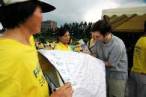 Une démonstration des exercices de Falun Gong faite par les jeunes pratiquants attire toujours l’attention des gens.. Il y avait près de 50 jeunes pratiquants de l’École de Minghui faisant les exercices de Falun Gong et chantant des chansons composées par les pratiquants pour louer le Dafa..