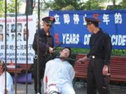 Les pratiquants de Falun Gong de Finlande, de Suède et de Danemark ont organisé une exposition anti-torture avec des simulations vivantes afin de révéler les méthodes de tortures utilisées contre les pratiquants de Falun Gong dans les camps de travaux forcés et les prisons de Chine. La brutalité de la persécution a été aussi révélés par des photos et posters qui montraient plus de vingt cinq méthodes de torture. L’exposition comprenait aussi des histoires de victimes de la torture en Chine à vous briser le cœur. L’une était raconté par Zhao Ming, un pratiquant de Falun Gong qui vit en Irlande et qui a été torturé de différentes façons pendant qu’il était illégalement détenu dans un camp de travaux forcés, parce qu’il pratique le Falun Gong. Un jour cinq policiers l’ont choqué avec six bâtons électriques de haut voltage sur tout le corps.