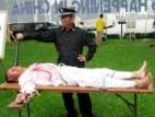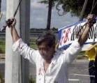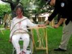 Le pratiquant de Falun Gong Chiluak Lu répète une des pratiques de torture dans les prisons chinoises durant une démonstration au Brunswick, Georgie, le 8 juin, 2004 près du site du Sommet G8. (Reuters photo)