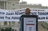 Le matin du 22 juillet, des pratiquants de Falun Gong des quatre coins du globe et d’autres personnes les soutenant ont tenu sur la colline du Capitol un rassemblement avec pour thème « le courage sans compromis. » Ils ont exigé la fin du terrorisme étatique imposé par le groupe de Jiang et de la persécution et des assassinats de pratiquants de Falun Gong.