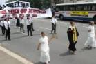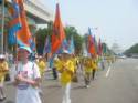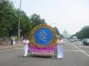 En tête du cortège se trouvait un groupe de jeunes femmes vêtues de blanc tenant dans leurs mains des fleurs de lotus artisanales. Il y avait aussi deux grandes banderoles sur lesquelles étaient imprimés « Mourn » (deuil) et l’autre contenait des photos de certains des pratiquants tués par la persécution. Il y avait aussi un très grand monument avec les noms gravés des pratiquants qui sont morts.