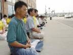 Nous nous sommes volontairement assis en rang à l’extérieur du consulat avons envoyé la pensée droite toutes les 30 minutes, au cours desquelles nous faisions les exercices. Des pratiquants de Taiwan se sont assis à gauche formant trois lignes et plusieurs pratiquants se tenaient debout derrière, tenant une banderole. Beaucoup d’entre eux étaient déjà allés à Washington D.C. pour la conférence de Falun Dafa, puis étaient allés à Boston pour le défilé, puis avaient continué ce voyage jusqu’à New York. Leur emploi du temps rempli n’affectait pas leurs esprits droits et leurs comportement compatissants. Les pensées droites des pratiquants de Dafa peuvent détruire toute la perversité et aucun mur d’acier ne peut nous empêcher d’accomplir notre mission.