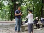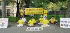 Aujourd’hui nous sommes allés encore au Central Park. Quand nous sommes arrivés au parc, l’autre groupe de pratiquants de Toronto était déjà là et était à faire les exercices de Falun Gong depuis plus d’une heure. Alors nous sommes allés à une autre entrée du parc où il y avait un espace ouvert. Nous avons installé des panneaux explicatifs et accroché la banderole. Deux pratiquants ont distribué des dépliants pendant que le reste d’entre nous, faisions les exercices et envoyions la pensée droite. L’effet a été très bon. La plupart des passants prenaient nos dépliants et plusieurs d’entre eux se sot arrêtés pour nous parler et en apprendre plus, ce qui était exactement ce que nous avions espéré.