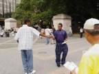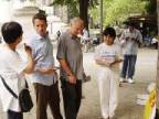 Malgré la pluie, deux jeunes pratiquants qui parlaient bien anglais, sont partis distribuer des dépliants de clarification et le reste d’entre nous, sommes restés pour faire les exercices. Le plus vieux d’entre nous était un pratiquant de Taiwan, âgé de 74 ans. Il disait à tous les passants : « Falun Dafa est bon ! » et leur donnait un dépliant qu’il gardait soigneusement sous son imperméable. Beaucoup de gens prenaient le dépliant. Il nous a dit : « Nous devrons leur dire Falun Dafa est bon, parce que cela éliminera la perversité. Même s’ils ne prennent pas le dépliant, nous devrions toujours les laisser entendre ‘Falun Dafa est bon’
