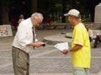 Tom a donné un dépliant à tous les Chinois vendant des choses le long de la rue. La plupart des piétons Chinois lui ont pris un dépliant et certain d’entre eux sont venus à nos panneaux d’exposition pour en apprendre plus. |