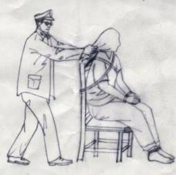 2. Un policier se tient derrière le pratiquant et se sert d’une ceinture de cuir pour tirer la tête du pratiquant vers l’arrière afin de l’immobiliser. Un autre policer alors, lui insère une paille de balai dans une de ses narines ce qui crée un sensation de démangeaison extrême mais il est incapable de bouger.