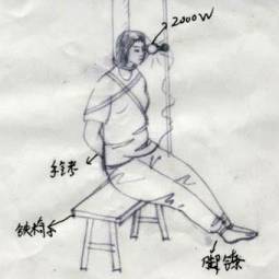 1. Les policiers se servent d’un sac en plastique pour couvrir la tête du pratiquant ce qui empêche le pratiquant de respirer et il se sent étourdi. Par la suite ils attachent les mains du pratiquant derrière le dos avec une main au-dessus de l’épaule tandis que l’autre est appuyée au bas du dos. Les policiers se servent de grande force pour rejoindre les deux mains pour les menotter ensemble. Cette torture génère une douleur extrêmement atroce pour le pratiquant.