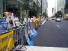 Dès leur arrivée, les pratiquants ont tout de suite formé « le Grand Mur du Courage » le long de la rue. Ils tenaient des tableaux illustrant la beauté du Falun Dafa, les policiers du régime de Jiang torturant les pratiquants de Falun Dafa et des introductions à la pratique. Ils ont déroulé des banderoles, demandant aux personnes de bonne volonté dans le monde d'aider pour que cesse la persécution. Sous le soleil brûlant, leur expression solennelle et le champ d'énergie pure de Dafa a touché de nombreux New Yorkais et des touristes. Les passants et les chauffeurs de taxi acceptaient les dépliants, les chauffeurs de car touristique ont pris des paquets de documents et les ont distribués à leurs passagers et aussi les passagers dans les voitures ont baissé leur vitre et accepté la documentation. Les personnes qui regardaient l'exposition contre la torture étaient émues jusqu'aux larmes, les gardiens de la sécurité et les policiers ont accepté nos dépliants. Les pratiquants de Falun Gong étaient loués chaudement pour leurs activités pacifiques.