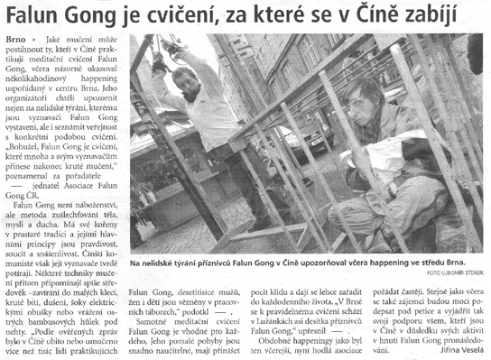 (Minghui.org) Ci dessous, deux articles tirés des journaux Tchèques de la ville de Brno Les gens sont tués en Chine pour leur pratique de Falun Gong Dans le centre de Brno, une activité de plusieurs heures a montré le type de tortures infligées aux personnes qui pratiquent Falun Gong en Chine. Les organisateurs de cet évènement voulaient aussi éveiller les consciences et présenter la pratique de Falun Gong au public. ‘’Heureusement, beaucoup de gens en sont venus a connaître le Falun Gong par les informations au sujet de la persécution inhumaine,’’ a noté un des organisateurs et membre de l’Association tchèque de Falun Gong. Falun Gong n’est pas une religion, mais une méthode de ‘cultivation’ du corps et de l’esprit. Elle est enracinée dans l’ancienne tradition Chinoise et ses principes sont Authenticité, Compassion et Endurance. Cependant, le Gouvernement Chinois persécute sévèrement les pratiquants de cette méthode. Quelques-unes de ces tortures nous ramènent au Moyen Age. Les personnes sont enfermées dans de petites cellules et soumises à de cruels passages à tabac, la suffocation, les chocs de matraques électriques ou des gardes dans les centres de détention leur insèrent des bambous sous les ongles. Selon une information fiable, plus de mille pratiquants de Falun Gong ont été battus à mort, des dizaines de milliers d’entre eux sont détenus illégalement dans des camps de travail. La pratique de méditation est elle-même adaptée pour les gens de tous âges, les exercices aux mouvements lents sont aisés à apprendre, ils peuvent soulager le stress et être pratiqués facilement dans la vie quotidienne. A Brno, il y a prés de dix pratiquants qui se rencontrent régulièrement dans le parc à Luzanky pour pratiquer les exercices. Les pratiquants Tchèques ont même prévu d’organiser plus d’activités comme celle d’hier au futur. Les gens auront d’autres chances de soutenir les activités et les pratiquants qui souffrent en Chine en signant des pétitions comme ils l’ont fait hier. Appel pour éveiller les consciences sur la persécution de Falun Gong