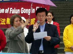 Pendant la conférence de presse, le pratiquant Zhang Chunyu a donné un discours. Il a dit que sa mère, Yang Huizhen, a été illégalement arrêtée pour la troisième fois le 24 mai 2004, par la police dans la ville de Dandong, province de Liaoning. Plus tard, sa mère a été détenue au centre de détention de Baifang, de la ville de Dandong. Presque en même temps que l'arrestation de sa mère, les officiers de police sont entrés de force chez sa soeur, Zhang Chungang et l'ont illégalement arrêtée. Maintenant, Chungang est détenue dans le camp de travaux forcés notoire de Masanjia. M. Zhang Chunyu a fortement demandé de l'aide pour arrêter la persécution et a spécifiquement invité le gouvernement fédéral d’empêcher Xia Deren d'entrer au Canada.