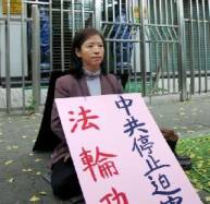 Avec son affiche, Suh a passé alors par le centre ville et est arrivée à l'ambassade chinoise pour protester contre la persécution et pour tenir une démonstration de protestation.