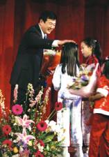 Le sourire du Maître, la façon dont Maître est penché et caresse doucement la tête d'un enfant, les enfants innocents avec les bouquets de fleurs dans leurs mains ainsi que les couleurs riches de l'arrangement des fleurs sur la scène...