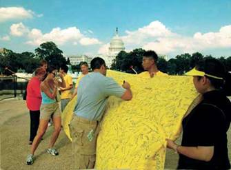 Un jeune homme signe sur le tissu alors que la brise douce gonfle le tissu vers l’avant. Une jeune femme prend une photographie d'une autre partie du tissu. Son action ajoute une autre histoire et une dimension différente à la photographie. Dans le fond, les personnes qui portent des chemises jaunes expliquent à deux passants la vérité sur le Falun Gong. La combinaison de couleur est belle et naturelle. Le tissu jaune est bien visible, attirant l'attention de l'assistance sur le thème de l'événement. La composition est propre et donne juste assez de détails pour indiquer que l'histoire a lieu devant le Capitol Hill à Washington, D.C.