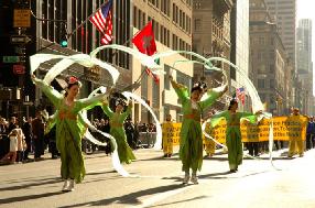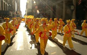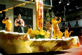 Le char des pratiquants de Falun Gong était un bateau. Sur la voile du bateau était écrit « Falun Dafa ». Dans le bateau, des pratiquants de différentes nationalités ont présenté sereinement les exercices de Falun Gong. De jeunes pratiquants assis sur des fleurs de lotus paraissaient aussi détachés. Ce beau bateau a navigué sur la 5e Avenue, paraissant majestueux. Une procession suivait le bateau en montrant les exercices lents et élégants du Falun Gong. Une troupe de joueurs de tambours à la taille se trouvait à la fin. Le son des tambours en rythme avec la musique « Falun Dafa est bon » a résonné tout le long de la rue et le maintien héroïque a réussi.