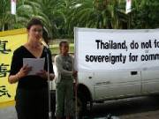 La pratiquante Kay Rubacek a lu la lettre ouverte lors du rassemblement. La lettre raconte l'incident survenu en Thaïlande : Le 10 décembre, incité par l'ambassade chinoise, la police thaïlandaise a violemment interféré dans la protestation des pratiquants devant l'ambassade. Le 14 décembre, la police thaïlandaise à Pattaya a battu 3 pratiquants qui avaient distribué des documents de clarification de la vérité. Le 15 décembre, 8 pratiquants, y compris 3 enfants (respectivement 3, 6, 14 ans) ont été arrêtés par la police thaïlandaise devant l'ambassade chinoise.