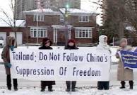 Le 15 décembre 2005, les pratiquants de Falun Gong d’Ottawa se sont rassemblés en face de l’ambassade de la Thaïlande, pour protester contre la violence de la police thaïlandaise à l’égard des pratiquants en Thaïlande. Le 10 décembre, lors de la journée internationale des droits humains, sous l’incitation de l’ambassade chinoise, les officiers de police Thaïlandais ont violemment interféré avec la protestation pacifique et légale des pratiquants de Falun Gong en face de l’ambassade chinoise à Bangkok.