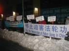 Un représentant des pratiquants de Falun Gong, M.Zhang, a crié un message au consulat chinois ”Les principes divins sont les plus justes, commettre des actes pervers va être punis”. M. Zhang a indiqué que Mme Liu Jizhi âgée de 51 ans est mère de deux filles, et que Han Yuzhi âgée de 42 ans est mère de trois enfants. Elles ont bénéficié physiquement et mentalement de leur pratique du Falun Gong. Le policier pervers He Xuejian, dans sa vingtaine, les a violées dans les bureaux du commissariat de la ville, alors que d’autres policiers étaient présents du début à la fin. Cela fait partie de la politique cruelle mise en oeuvre pour persécuter le Falun Gong par le régime de Jiang qui transforme les policiers en animaux qui violent les mères. C’est un principe divin que le bien sera récompensé et le mal sera puni. Les auteurs de ces crimes et leur complices seront certainement punis par les cieux.