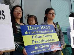 Les pratiquants de Falun Gong tiennent des banderoles et affiches devant le consulat argentin
