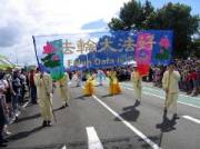 En face du « bateau FA », il y avait une bannière sur laquelle on pouvait lire : « Falun Dada est Magnifique » et une équipe tenant des drapeaux se trouvait devant. Quatre femmes costumées en demoiselles célestes dansaient gracieusement au son de la musique. Derrière le bateau suivait une équipe jouant du tambour. Partout où le défilé arrivait, les gens prenaient des photos, acclamaient et applaudissaient. Plusieurs enfants ont couru jusqu’au défilé pour prendre des photos avec les demoiselles célestes.