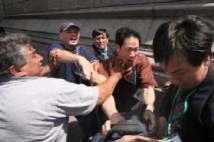 Le 14 décembre 2005 pendant la visite de Luo Gan en Argentine, l’Ambassade chinoise a envoyé des voyous pour attaquer les pratiquants qui protestaient contre la persécution. Ils portaient du blanc ou du rouge avec un badge vert (photo par Carlos Carbone)