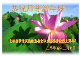 Nous ferons certainement bien les trois choses de tout cœur selon les demandes du Maître et la norme pour les disciples de Dafa lors de la période de la rectification de la loi. Nous accomplirons nos engagements sacrés faits il y a longtemps avant l'histoire ainsi que notre mission de sauver les êtres lors de la période de rectification de la loi. Nous veillerons à utiliser entièrement toutes les occasions de coopérer harmonieusement avec les pratiquants en Chine et de mieux employer notre temps pour sauver raisonnablement, sagement et à grande échelle les gens en Chine qui sont encore trompées par l'esprit toxique. Nous veillerons à nous améliorer selon la norme la plus élevée pour les disciples Dafa lors de la période de la rectification de la loi et nous améliorer comme un tout, pour devenir des êtres vraiment qualifiés du premier titre de noblesse de l’univers – les disciples Dafa et accomplirons notre mission sacrée pour sauvegarder le firmament. Maître nous vous prions d’en être assuré. Nous accomplirons certainement ceci. Nous souhaitons de nouveau au Maître une Bonne et Heureuse Année Lunaire !