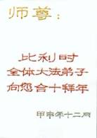 Les mots sur l’image de gauche signifie : Maître Vénérable, tous les pratiquants de Belgique vous disent Heshi et vous envoient leurs salutations pour le Nouvel An chinois.