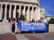 L’immense banderole avec les mots écrits en blanc sur un fond bleu, en chinois et en anglais, et placée en évidence dans le campus attirait le regard. La banderole portait l’inscription, « Guo Chuanjie est poursuivi pour des accusations de torture et de génocide pour sa persécution du Falun Gong à l'Académie chinoise des Sciences » Une statue en bronze symbolisant l'impartialité était derrière la banderole et ajoutait à la solennité de la conférence de presse. Un groupe de jeunes hommes asiatiques est passé tout près, et certains d'entre eux étaient très intéressés. Ils ont posé des questions et ont pris des photos. Les pratiquants leur ont fait part de l’essentiel de la situation. Quelques professeurs et étudiants du campus se sont également arrêtés et ont voulu également connaître les détails et ils ont discuté entre eux du problème. On a signalé que Guo Chuanjie et un groupe de visiteurs avaient projeté des activités sociales sur le campus de l’Université de Colombia durant l’après-midi du 23 février 2005. L’avocate Mme Han a intenté la poursuite, déclarant que la plainte avait été déposée à la Cour fédérale de New York, le 22 février 2005 vers 9h30 du matin, une citation et une plainte avaient été remises au secrétaire adjoint du Parti de l’Académie chinoise des Sciences, Guo Chuanjie qui visitait le Battery Park de Manhattan à New York Guo Chuanjie