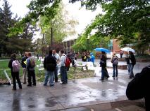 L’exposition contre la torture a eu lieu sur le gazon dans une section du campus appelée « Zone de liberté de parole ». Beaucoup de gens se sont arrêtés pour regarder à la démonstration de torture et les affiches expliquant les méthodes de torture appliquées sur les pratiquants en Chine. La plupart des passants ont accepté les documents de clarification de la vérité. Beaucoup de gens ont parlé aux pratiquants et ont demandé comment ils pouvaient aider.