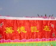 Cette année, une pratiquante de Falun Dafa dans le village a voulu se servir de cette opportunité pour clarifier la vérité et promouvoir le Dafa, alors elle a fabriquée deux bannières, l’une d’entre elles mesurant 2,8 mètres de long et 1 mètre de large. Sur la bannière en soie dorée, les caractères chinois disaient « Les êtres humains ont besoin de Sincèrité-Bienveillance-Patience. » Chaque caractère des mots, « Les êtres humains ont besoin » mesurait 25 cm de large, et chaque caractère de « Sincèrité-Bienveillance-Patience » mesurait 38 cm de large. On pouvait lire sur l’autre côté de cette bannière, « La lumière de Bouddha brille partout. » Chaque caractère mesurait 35 cm de large. La deuxième bannière mesurait 3,2 mètres de long et 1 mètre de large et était sur fond rouge. Sur un côté, on lisait les mots dorés, « Avec grande compassion et vertu » et sur l’autre côté, « Sincérité, Bonté, Pardon, Tolérance. » Les deux bannières brillaient dans le soleil et attiraient vraiment le regard.