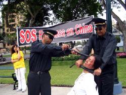 Le 13 novembre 2004, dans un parc en face de l’ambassade chinoise à Lima, la capitale du Pérou, les pratiquants en Pérou ont tenu une exposition de photos et ont fait une démonstration des méthodes de torture employées par le régime de Jiang contre les pratiquants, afin d’exposer au public et aux médias la persécution du Falun Gong en Chine.