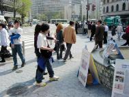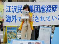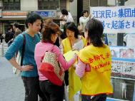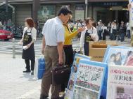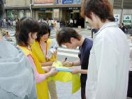 La court Suprême des Etats-Unis va bientôt décider de revoir le procès contre l’ancien dirigeant chinois Jiang Zemin pour crime de génocide et de torture. Afin d’amener Jiang devant la justice et de soutenir le procès mondial à son encontre, les pratiquants de Falun Gong de la région de Kinki au Japon ont organisé une activité pendant la journée du 10 avril 2005 à Osaka. Pendant la journée, il y a eu des discours, une pétition a été emmenée dans les quartiers les plus peuplés d’Osaka. L’évènement a été soutenu par d’autres organisations.