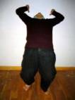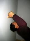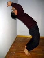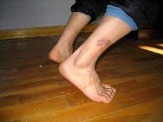 Photos de re-constitution d’une méthode de torture utilisées sur M. Zhao : on a obligé M. Zhao à se tenir dans les positions sur les photos. Il s’est tenu avec ses deux pouces au dessus de la tête tout en poussant sur le mur et en se tenant sur le bout des orteils. Les tortionnaires tenaient des aiguilles (pointées vers le talon de M. Zhao) sur le plancher. Après un court moment, les jambes de M. Zhao ont commencé à trembler et il ne pouvait plus se tenir sur les orteils. La douleur était atroce à mesure qu’il abaissait ses talons sur les aiguilles. Les tortionnaires battaient M. Zhao lorsqu’il n’obéissait pas à leurs ordres dans cette position.