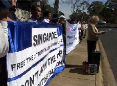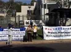 Le 3 mai 2005, les pratiquants en Australie se sont à nouveau rendu à l’ambassade de Singapour à Canberra pour faire appel contre le verdict injuste remit par la court de Singapour il y a plusieurs jours déjà contre les deux pratiquantes de Falun Gong Mme Ng Chye Huay et Mme Cheng Lujin. Ils ont demandé au gouvernement de Singapour de cesser de participer à la persécution du Falun Gong pour ne pas ainsi devenir complice du PCC. Les pratiquants ont remis aux employés de l’ambassade des pétitions venant de pratiquants et de gens de tous les horizons.