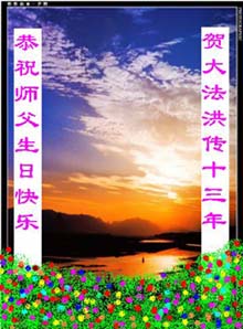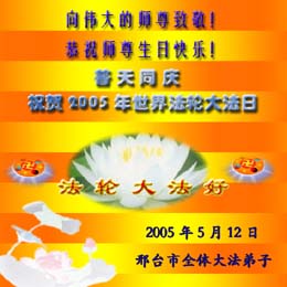 Les pratiquants de la ville de Pingdu, dans la province de Shandong félicitent notre vénéré Maître en en ce 13ème anniversaire de l’enseignement de la Loi ! La grâce immense de Maître et son énorme bienveillance La Loi qui rectifie l’univers prépare sa conclusion Les fantômes et les démons sont éliminés, l’univers est nettoyé En sauvant les êtres vivants et en créant le firmament grandiose Maître soyez rassuré ! Vos disciples seront à la hauteur du salut bienveillant de notre vénéré Maître, suivront le processus de la rectification de la loi de près et feront bien les trois choses. Tous les pratiquants de la ville de Pingdu, province de Shandong Le 10 mai 2005 Les pratiquants de Xuchang, province de Henan souhaitent leurs meilleurs voeux et envoient leurs félicitations au vénéré Maître en cette Journée mondiale de Falun Dafa ! Légende : Les pratiquants de Xuchang, Henan saluent notre bienveillant et grand Maître! Célébration de la 6ème Journée mondiale de Falun Dafa dans les cieux et sur la terre ! Signé : Tous les pratiquants de Xuchang, Heshi Le 11 mai 2005 Les pratiquants de Xingtai, dans le Hebei, souhaitent un joyeux anniversaire à notre vénéré Maître, avec tout leur respect ! Les pratiquants de Yantai souhaitent un heureux anniversaire à notre grand Maître bienveillant ! Maître, soyez assuré ! Nous cultiverons Dafa fermement et suivrons le Maître de près. Nous ferons bien les trois choses, suivrons bien le processus de la rectification de la loi et franchirons chaque pas avec détermination. Avec tous nos respects, Signé : les pratiquants de Yantai Le 11 mai 2005 Les pratiquants de Xuchang, province de Henan émettent leurs meilleurs voeux à notre grand et bienveillant Maître ! Nous lui souhaitons un joyeux anniversaire ! Vénéré Maître, Pour Votre anniversaire, tous les pratiquants de Xuchang Vous témoignent leur plus haut respect! Nous souhaitons un heureux anniversaire à Maître ! Dix mille mots ne peuvent exprimer le respect et la reconnaissance que nous avons pour notre vénéré Maître ! Dix mille mots dans une seule phrase : Maître, vous avez tant fait ! Vous manquez à vos disciples. Maïtre, soyez rassuré, vos disciples se cultiveront bien, feront bien les trois choses et marcherons solidement sur le chemin qui reste à parcourir. Le 11 mai 2005 Tous les pratiquants de l’Université de Wuhan souhaitent un heureux anniversaire à Maître et célèbrent la 6ème Journée mondiale de Falun Dafa ! En ces derniers moments critiques, nous ne laisserons pas tomber le salut bienveillant de Maître et n'oublierons pas notre serment préhistorique. Nous renforcerons notre étude de la Loi, saisirons le temps pour clarifier la vérité, et tenterons ardemment de bien faire les trois choses que les disciples de Dafa de la période de la rectification de la loi doivent faire. Heshi, Avec tout leur respect, Signé : les pratiquants de l’Université de Wuhan Les pratiquants de la région de Linzi, à Zibo, de l’usine pétro-chimique de Qilu, dans la province de Shandong souhaitent un heureux anniversaire à notre Maître, avec tout leur respect ! Les pratiquants de la ville de Chengdu souhaitent un joyeux anniversaire à notre Maître ! Les pratiquants en Chine souhaitent un heureux anniversaire à Maître, avec tout leur respect ! Les pratiquants originaires de Manchuria actuellement à Pékin souhaitent un joyeux anniversaire à notre grand et bienveillant Maître, avec tout leur respect ! Nous sommes reconnaissants pour la grâce de Maître. Vos disciples seront à la hauteur des attentes de Maître et feront bien les trois choses. Les pratiquants qui restent chez eux pour éviter les persécutions célèbrent l’anniversaire de notre vénéré Maître en ce 13ème anniversaire de l’enseignement public du Falun Dafa et en cette Journée mondiale du Falun Dafa ! Poème sur la photo: Ode à la grâce de Maître Le vénéré et bienveillant Maître rectifie le cosmos Dafa crée de nouveaux cieux et un nouvel univers Tout semble frais et beau, le cosmos est lumineux et nettoyé Les fleurs de pruniers fraîches d'hiver célèbrent la grâce du Maître en souriant Les pratiquants en Chine souhaitent un heureux anniversaire à notre vénéré Maître, avec tout leur respect ! Les pratiquants de Xianning, province de Hubei souhaitent un heureux anniversaire à notre Maître ! Tous les pratiquants du comté de Lingshou, dans la province de Hebei souhaitent un joyeux anniversaire à notre vénéré Maître ! Vénéré Maître Nous vous souhaitons un bon anniversaire ! Vous avez travaillé si dur ! Vous manquez aux pratiquants du comté de Lingshou, dans la province de Hebei ! Voeu 54tème Anniversaire du vénéré Maître L’univers entier célèbre avec une joie infinie Avançons diligemment et faisons bien les trois choses Réalisons notre vœu et notre plus grand souhait Signé : Tous les pratiquants du comté de Lingshou, dans la province de Hebei Heshi Tous les pratiquants de la ville de Jixi, dans la province du Heilongjiang souhaitent un heureux anniversaire à notre vénéré Maître ! Les pratiquants de Chongqing félicitent Maître en ce 13ème anniversaire de la présentation du Falun Dafa et lui souhaitent un joyeux anniversaire ! Une pratiquante de retour chez elle après avoir été détenue à la prison pour femmes de Heilongjiang parle au nom de toutes les pratiquantes incarcérées et célèbre pour elles l’anniversaire de notre vénéré Maître ainsi que le 13e anniversaire de la présentation publique du Falun Dafa ! |