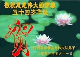 Tous les pratiquants de Dafa du comté de Yongxiu, province de Jiangxi souhaitent à notre grand et bienveillant Maître un heureux anniversaire et célèbrent le 13e anniversaire de la présentation du Dafa au public