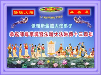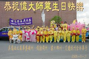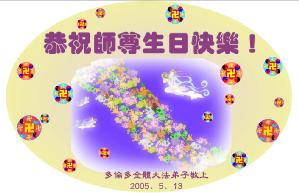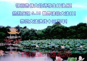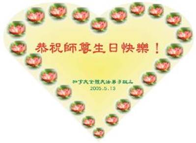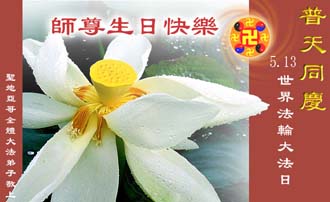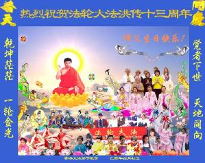 Tous les pratiquants, loin de chez eux, souhaitent au grand Maître Bienveillant un Joyeux Anniversaire ! Nous fêtons le 13e Anniversaire de la présentation du Falun Gong au public et la Journée Mondiale du Falun Dafa !
