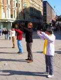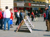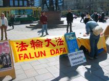 Le matin du 25 avril, un groupe de pratiquants finlandais venaient juste de finir les activités devant l’Ambassade de Chine pour appeler à la fin de la persécution. Ils se sont ensuite rendus dans le centre de la ville de Helsinki pour y tenir une exposition photos en mémoire du sixième anniversaire de l’incident « du 25 avril » où 10 000 pratiquants sont allés pacifiquement au Bureau des Appels de Zhongnanhai pour informer les autorités chinoises des abus de droits de l’hommes à l’encontre du Falun Gong.