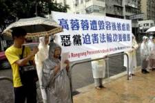 Sous la pluie torrentielle, quelques pratiquants de Hong Kong manifestent devant le Bureau de liaison chinois, demandant le châtiment sévère des meurtriers