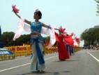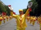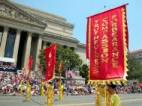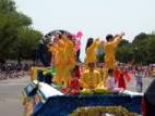 Le groupe de pratiquants de Falun Gong comprenait un char allégorique avec des pratiquants faisant les exercices, le groupe des fées célestes, la troupe des tambours à la ceinture et un groupe de drapeaux.