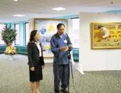 James Aldon, Président du club national d'art, a alors fait un discours. Il a dit que le club national d'art a présenté l'exposition d'art « Authenticité, Bienveillance, Patience » à deux reprises et a reçu plusieurs appels téléphoniques d'intimidation. Basé sur la liberté d'expression artistique, M. Aldon a insisté pour que l'exposition se déroule tel que prévue. L’exposition fut très bien accueillie par les résidents. Dans son discours, M. Aldon a grandement félicité le niveau d'excellence des artistes pratiquants et a exprimé sa satisfaction avec les pratiquants de Falun Gong.